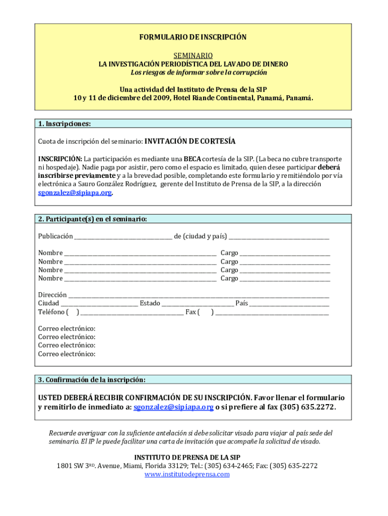 FORMULARIODEINSCRIPCIN SEMINARY LAINVESTIGACINPERIODSTICADELLAVADODEDINERO Losriesgosdeinformarsobrelacorrupcin UnaactividaddelInstitutodePrensadelaSIP 10y11dediciembredel2009,HotelRiandeContinental,
