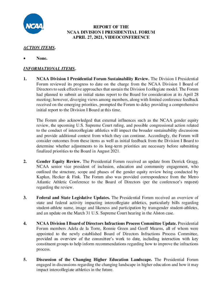 REPORT OF THE NCAA DIVISION I PRESIDENTIAL FORUM APRIL 27, 2021, VIDEOCONFERENCE ACTION ITEMS. None.INFORMATIONAL ITEMS. 1.NCAA Division I Presidential Forum Sustainability Review. The Division I