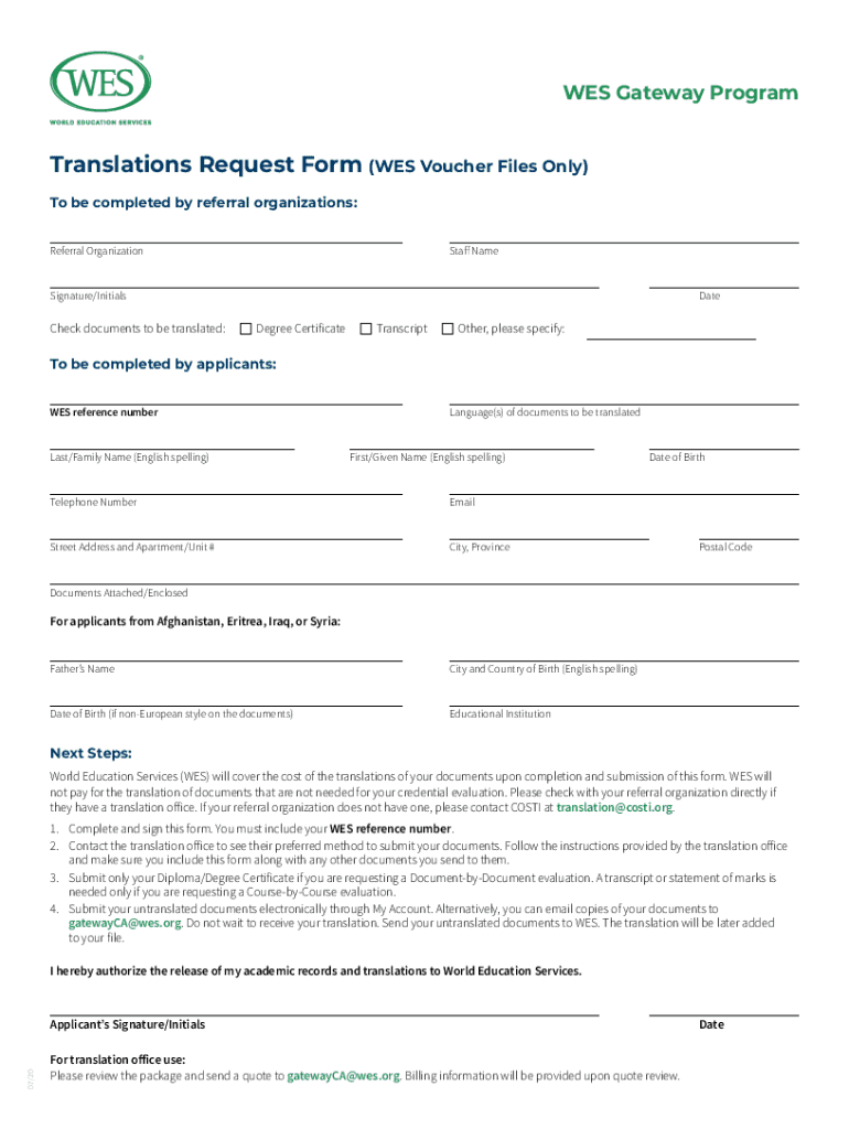 WAS Gateway ProgramTranslations Request Form (WAS Voucher Files Only) To be completed by referral organizations: Referral OrganizationStaff NameSignature×InitialsCheck documents to be translated:DateDegree