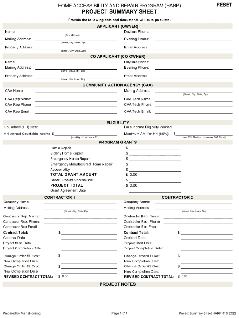 RESTORE ACCESSIBILITY AND REPAIR PROGRAM (HARP×PROJECT SUMMARY SHEET Provide the following data and documents will autopopulate:APPLICANT (OWNER) Name:Daytime Phone: (First MI Last×Mailing Address:Evening