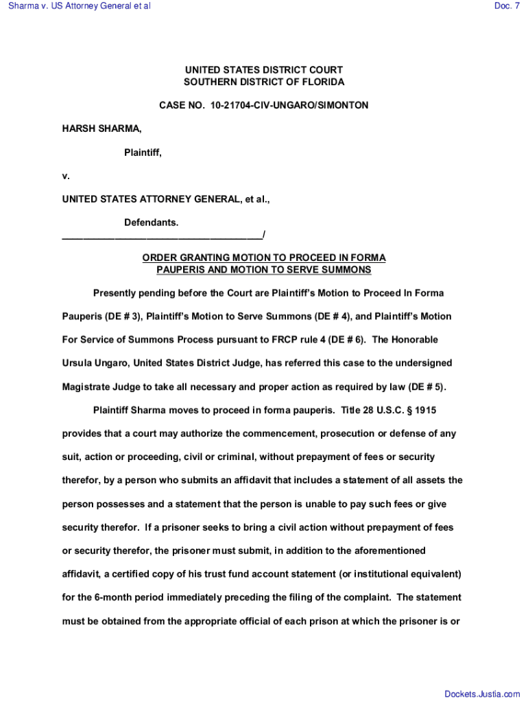 Sharma v. US Attorney General et Aldo. 7UNITED STATES DISTRICT COURT SOUTHERN DISTRICT OF FLORIDA CASE NO. 1021704CIVUNGARO×EDMONTON HARSH SHARMA, Plaintiff, v. UNITED STATES ATTORNEY GENERAL, et