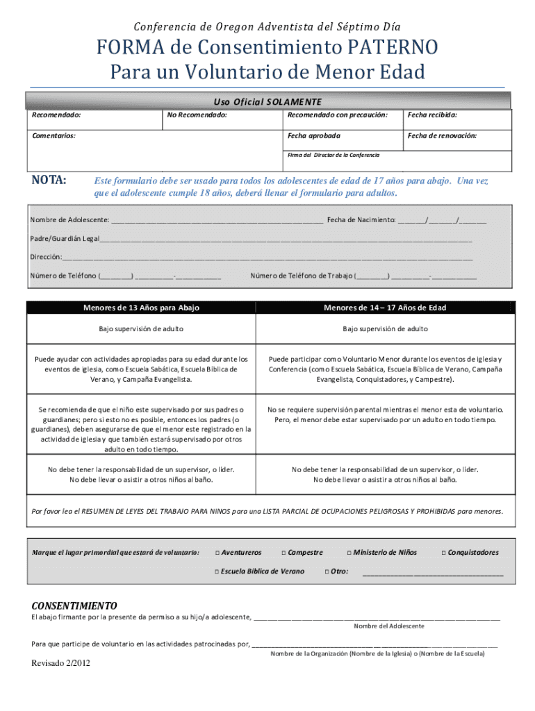 Conference de Oregon Adventist del Spiro Deform de Consentimiento PATE RNO Para UN Voluntary de Menor Dad USO Official SOLAMENTERecomendado:Now Recommended:Commentaries:Recommended con precaution:Tech