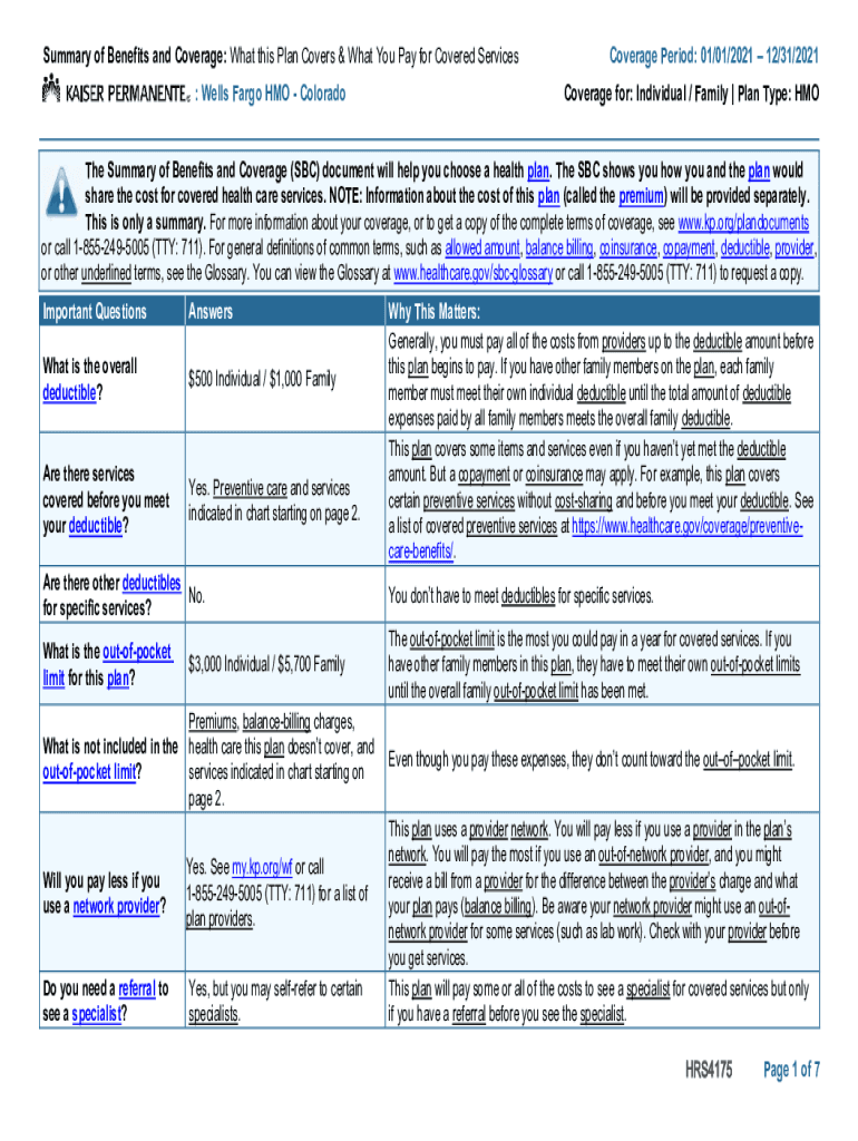 Summary of Benefits and Coverage: What this Plan Covers & What You Pay for Covered Services : Wells Fargo HMO ColoradoCoverage Period: 01×01/2021 12×31/2021 Coverage for: Individual / Family | Plan