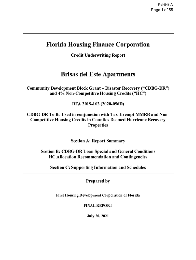 Exhibit A Page 1 of 55Florida Housing Finance Corporation Credit Underwriting Reportorial Del Ester Apartments Community Development Block Grant Disaster Recovery (CDB GDR) and 4% Noncompetitive Housing