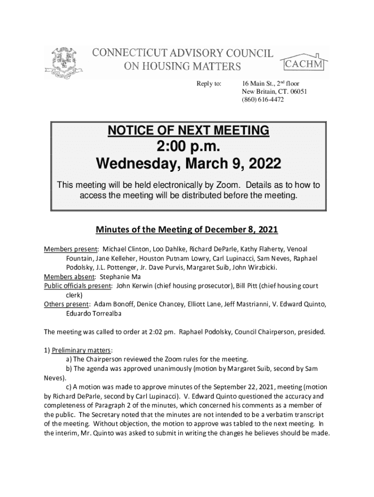 Reply to:16 Main St., 2nd floor New Britain, CT. 06051 ×860) 6164472NOTICE OF NEXT MEETING2:00 p.m. Wednesday, March 9, 2022, This meeting will be held electronically by Zoom. Details as to how to
