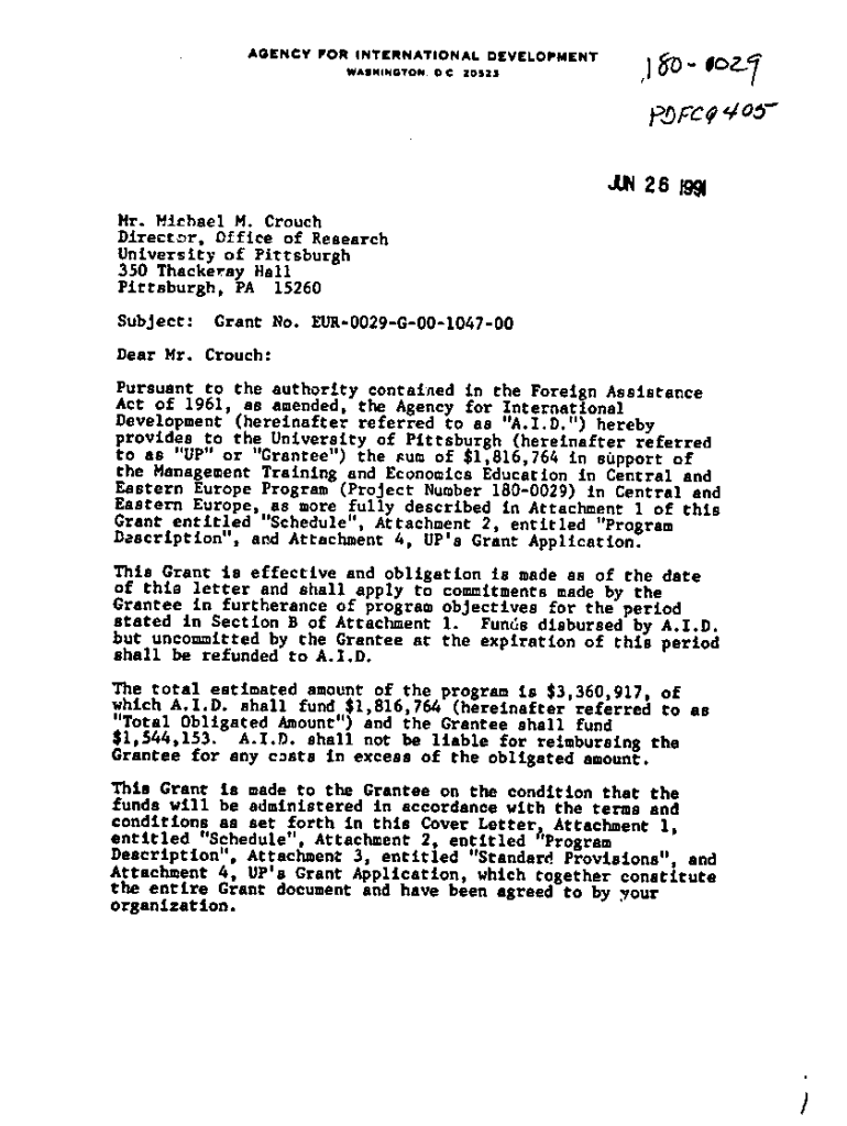 AGENCY FOR INTERNATIONAL DEVELOPMENT AGENCY WASHINGTON. D C 205231\'(JUN 26 Mr. Michael M. CrouchDirector, Office of ResearchUniversity of Pittsburgh350 Thackeray Hall Pittsburgh, PA 15260Subject:Grant