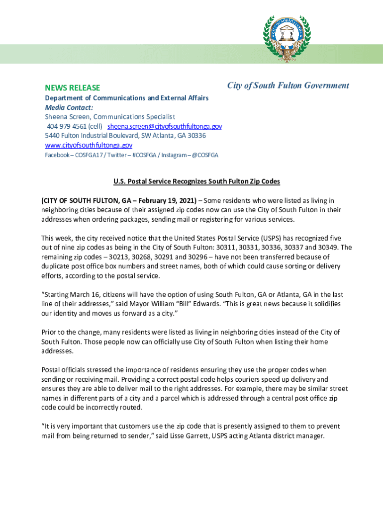 City of South Fulton Governments RELEASEDepartment of Communications and External Affairs Media Contact: Sheena Screen, Communications Specialist 4049794561 (cell) Sheena. Screen@cityofsouthfultonga.gov