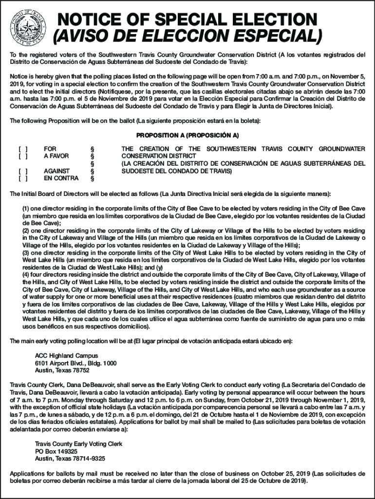 NOTICE OF SPECIAL ELECTION (AVIS ODE ELECTION ESPECIAL) To the registered voters of the Southwestern Travis County Groundwater Conservation District (A Los rotates registrants Del District de Conservacin