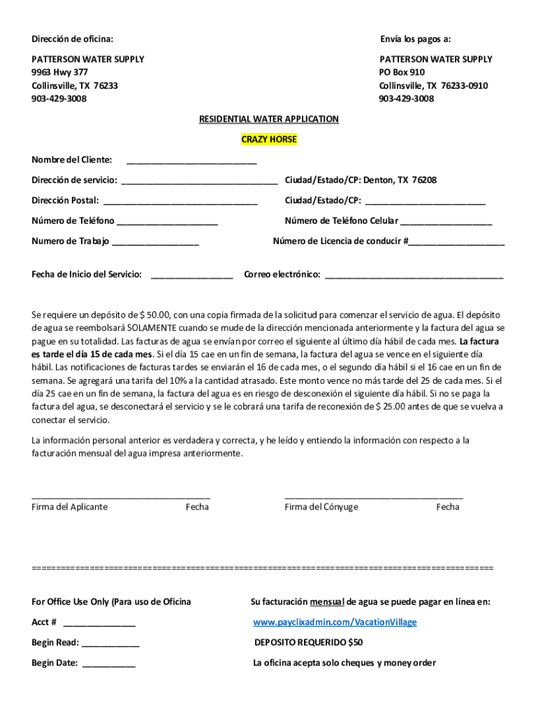 Direction DE official:Envy Los pages a:PATTERSON WATER SUPPLY 9963 Hwy 377 Collinsville, TX 76233 9034293008PATTERSON WATER SUPPLY PO Box 910 Collinsville, TX 762330910 9034293008 RESIDENTIAL WATER