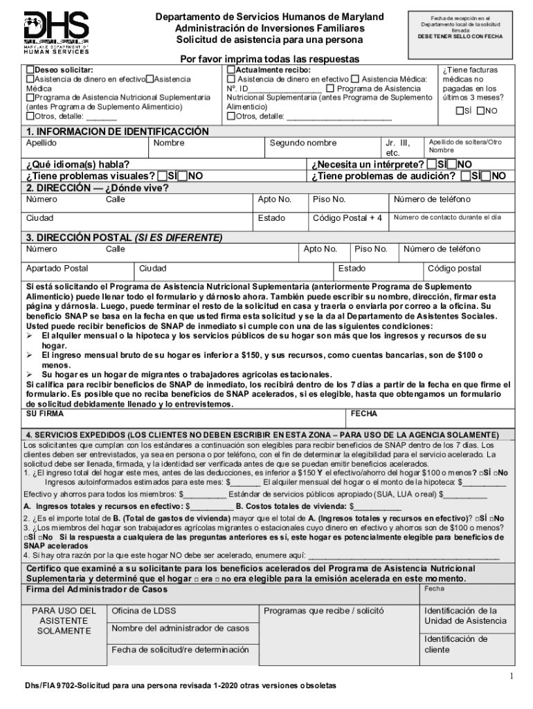 Department de Servicios Humans de Maryland Administration de Inversiones Familiars Solicited de asistencia para RNA personaFecha de reception en El Department local DE la solicited Narmada DEBT TENDER
