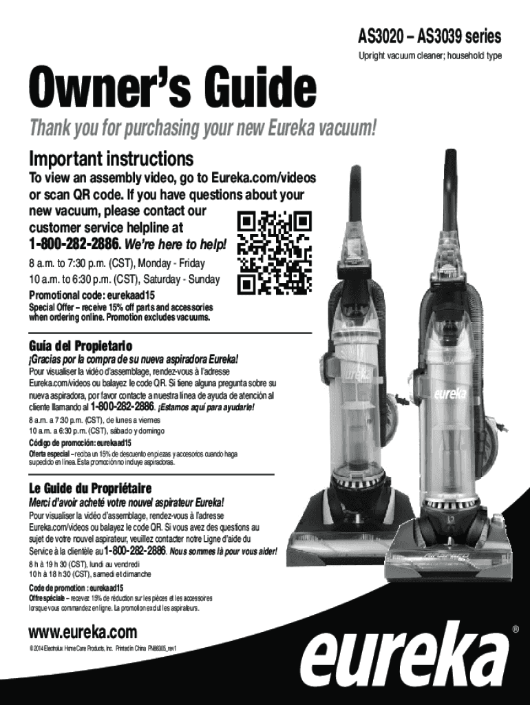 AS3020 AS3039 seriesOwners GuideUpright vacuum cleaner; household typeThank you for purchasing your new Eureka vacuum! Important instructions view an assembly video, go to Eureka.com×videos or scan