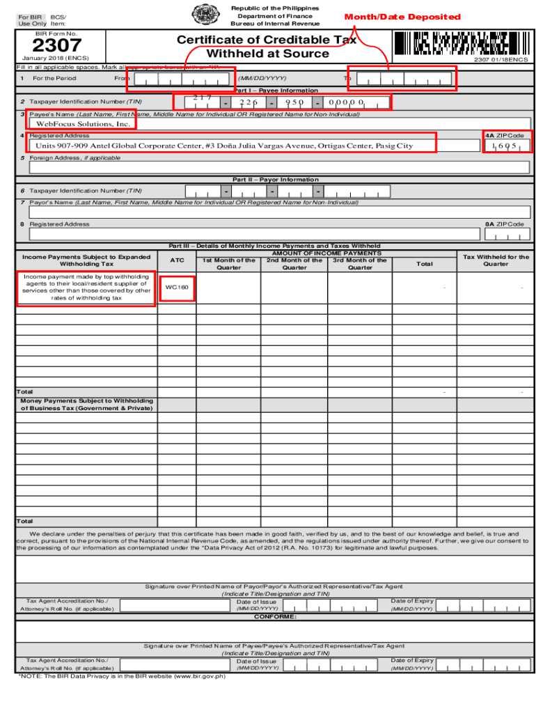 Republic of the Philippines Department of Finance Bureau of Internal Revenuer BIR BCS/ Use Only Item: BIR Form No. Month/Date DepositedCertificate of Creditable Tax Withheld at Source2307 January