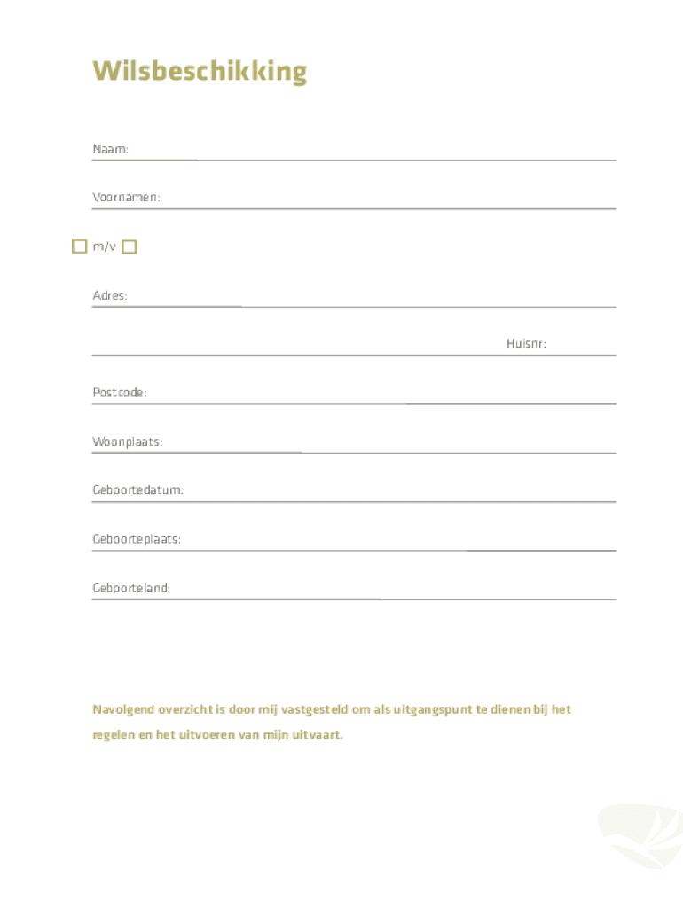 N poor later Min wilsbeschikkingZoals min even is, ZO will in min afscheidDeze wilsbeschikking beware big UW persoonlijke elevens of big UW uitvaartpolis. Wilsbeschikking Nam:Journeymen’m×cadres:Hooper:Postcode:Woonplaats:Geboortedatum:Geboorteplaats:Geboorteland:Navolgend