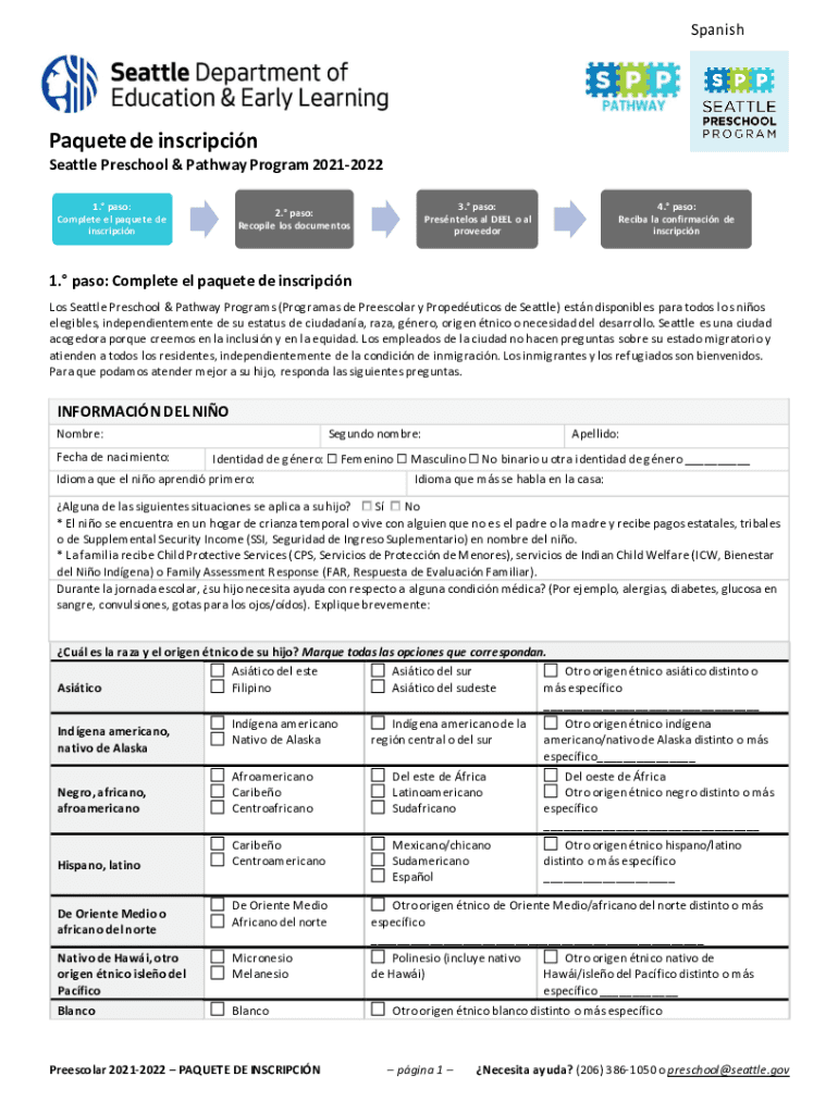 SpanishPaquete de inscription Seattle Preschool & Pathway Program 20212022 1. Pass: Complete el Paiute de inscripcin3. Pass: Presenters all DEAL o all proveedor2. Pass: Recompile Los documentos4.