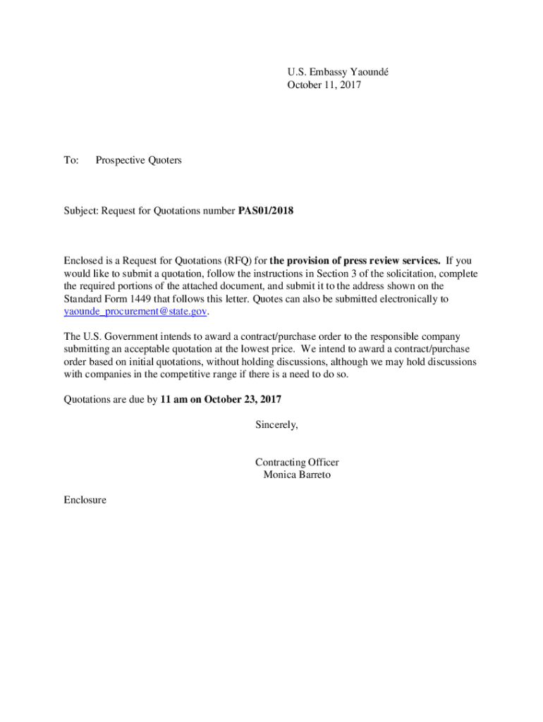 U.S. Embassy Yaoundé October 11, 2017To:Prospective QuotersSubject: Request for Quotations number PAS01×2018Enclosed is a Request for Quotations (RFQ) for the provision of press review services.
