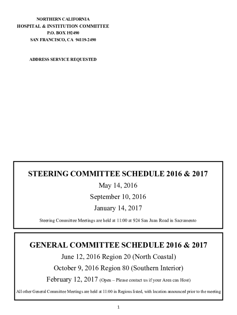 NORTHERN CALIFORNIAHOSPITAL & INSTITUTION COMMITTEE P.O. BOX 192490SAN FRANCISCO, CA 941192490 ADDRESS SERVICE REQUESTEDSTEERING COMMITTEE SCHEDULE 2016 & 2017 May 14, 2016September 10, 2016 January