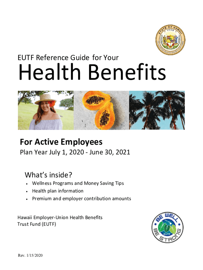 EUTFReferenceGuide forYourHealthBenefits ForActiveEmployees PlanYearJuly1,2020June30,2021Whatsinside? WellnessProgramsandMoneySavingTips Healthplaninformation PremiumandemployercontributionamountsHawaiiEmployerUnionHealthBenefits