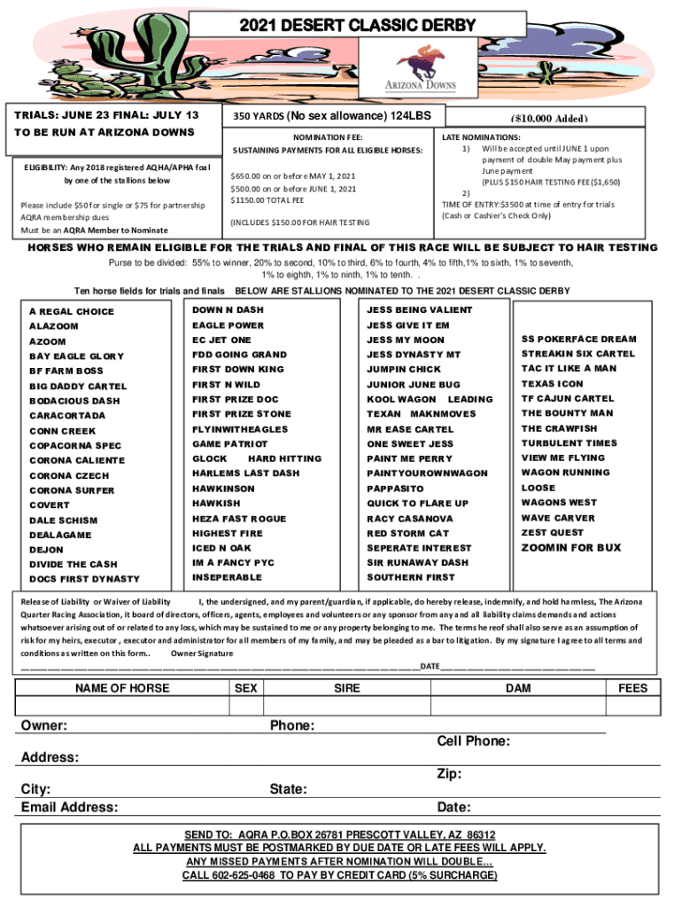 2021 DESERT CLASSIC DERBYTRIALS: JUNE 23 FINAL: JULY 13 TO BE RUN AT ARIZONA DOWNS ELIGIBILITY: Any 2018 registered AQUA×ALPHA foal by one of the stallions below Please include $50 for single or