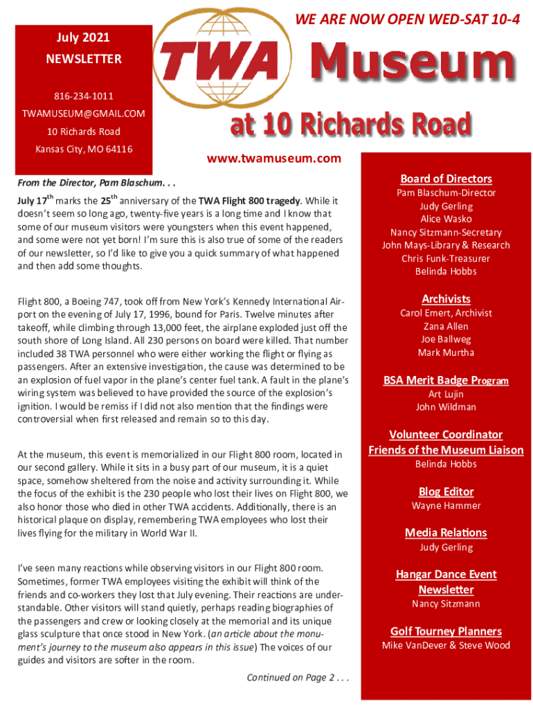 July 2021WE ARE NOW OPEN We'd SAT 104NEWSLETTER 8162341011 MUSEUM×GMAIL.COM 10 Richards Road Kansas City, MO 64116www.twamuseum.com Board of DirectorsFrom the Director, Pam Blanche. . . July 17th