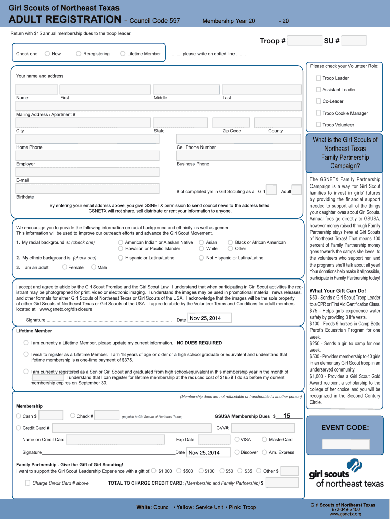 The Girl Scouts Adult Registration Form is essential for adults seeking to contribute to the Girl Scouts organization in various leadership roles. This form enables individuals such as troop leaders, assistant leaders, co-leaders, troop cookie managers, and volunteers to officially register and become part of the community. With an annual membership fee of $15, this form plays a crucial role in supporting the organization and its mission of promoting youth leadership.