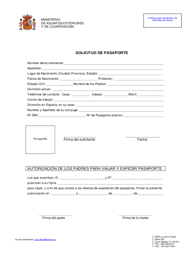 CONSULAR GENERAL DE ESAA EN MIAMIMINISTERIO DE SANTOS EXTERIORS Y DE COOPERACINSOLICITUD DE PASSPORT Hombre Del×la solicit ante: ___ Spellings: ___ Lugar de Nacimiento (Ciudad, Provincial, Est ado)