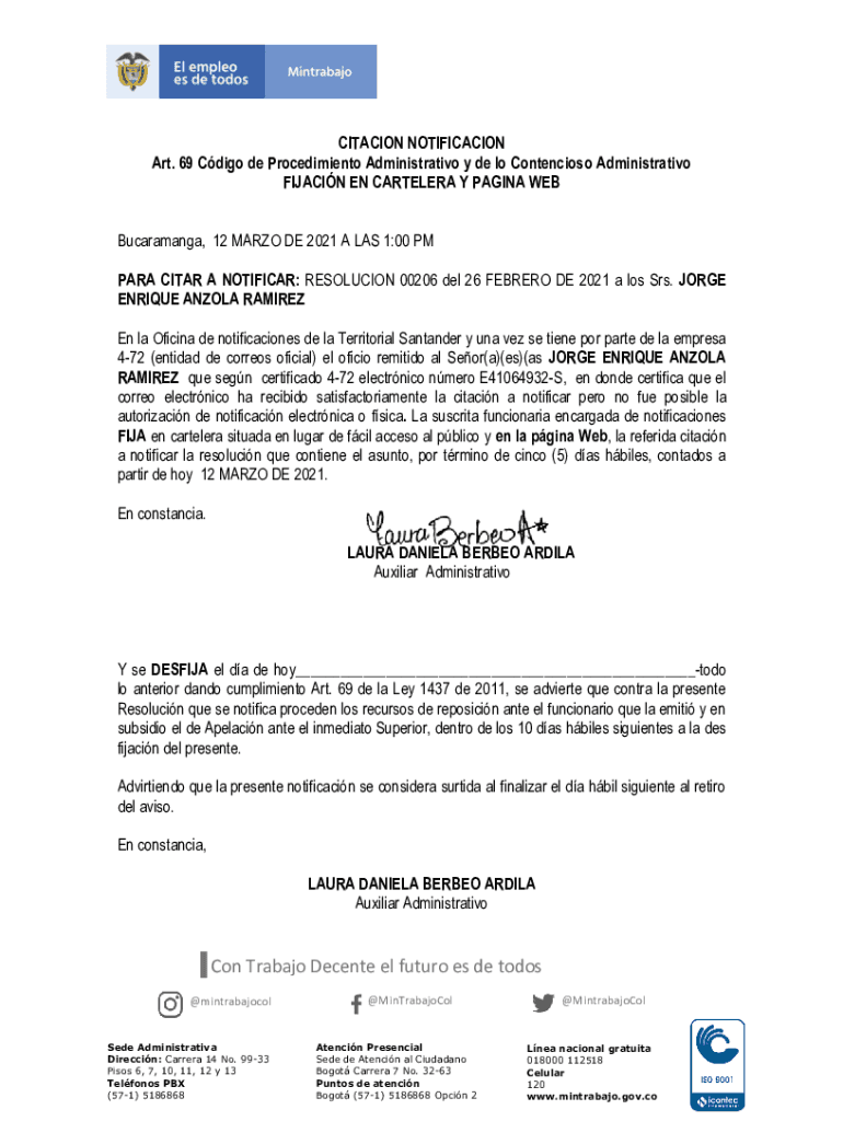 CITATION NOTIFICATION Art. 69 Cargo de Procedimiento Administrative y de lo Contention Administrative NIACIN EN CARTEL ERA Y PAGING WEB Bucaramanga, 12 MARIO DE 2021 A LAS 1:00 PM PARA CIGAR A NOTIFIER: