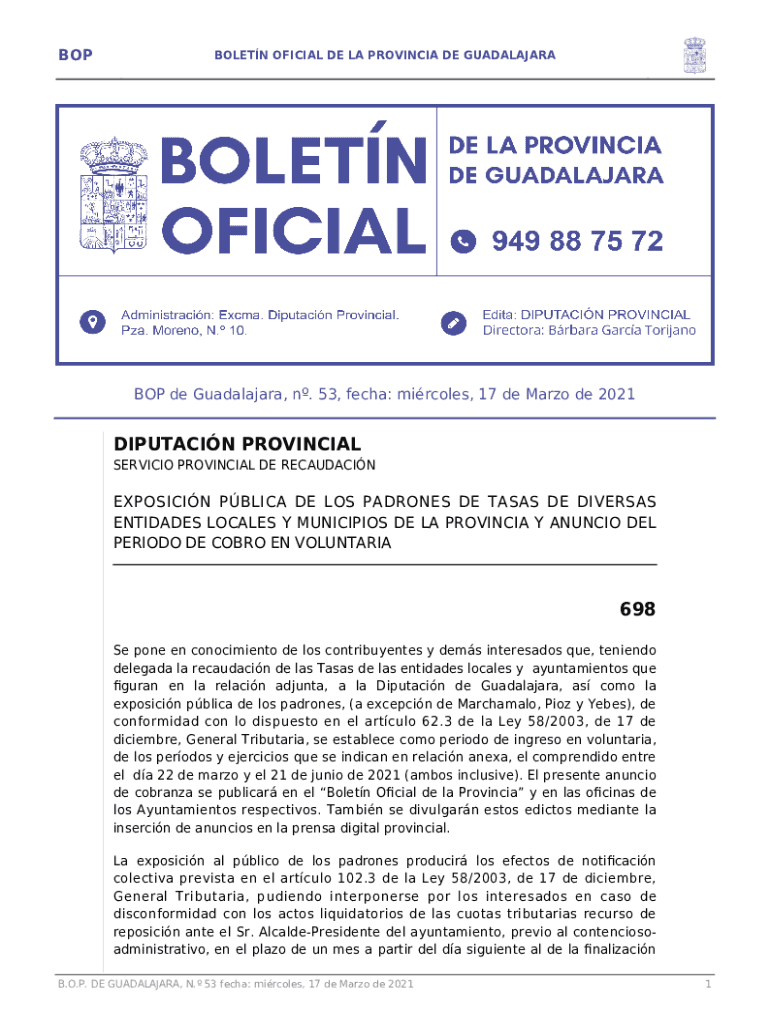 BOOLEAN OFFICIAL DE LA PROVINCIAL DE GUADALAJARA, n. 53, tech: circles, 17 de Mario de 2021DIPUTACIN PROVINCIAL