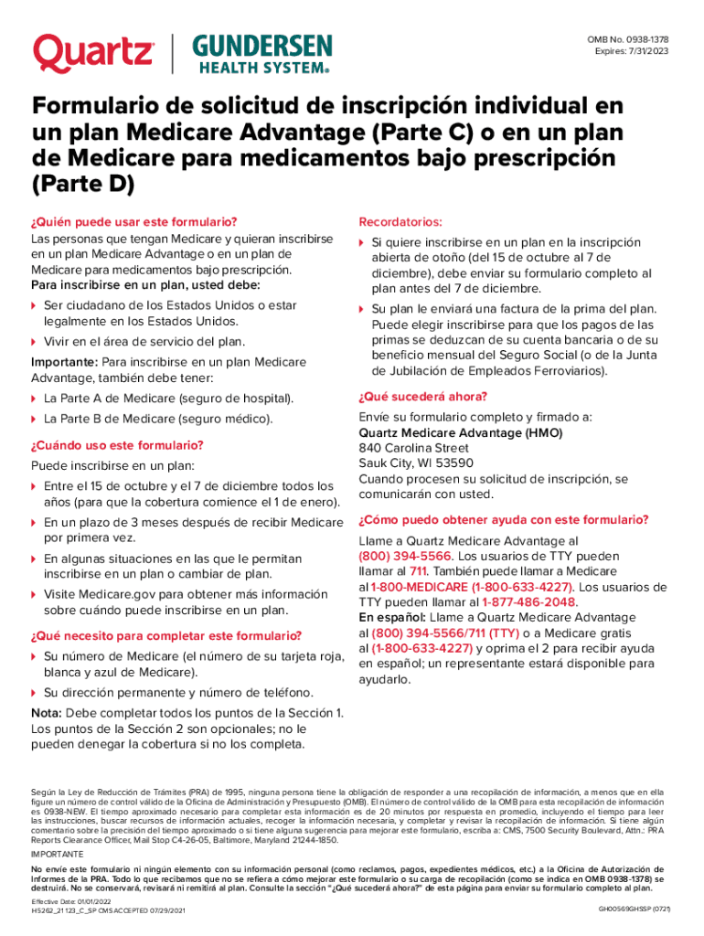 OMB No. 09381378 Expires: 7×31/2023Formulario de solicited DE inscription individual en UN plan Medicare Advantage (Parted) o en UN plan de Medicare para medicament banjo prescription (Parted) Quin