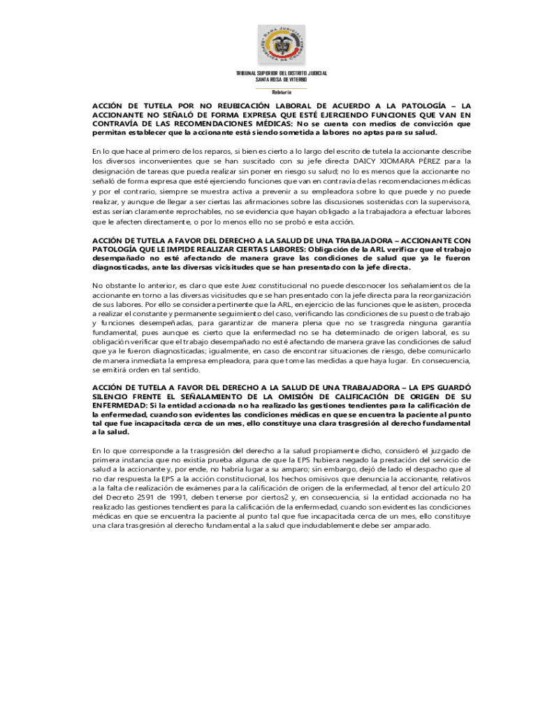 TRIBUNAL SUPERIOR DEL DISTRICT JUDICIAL SANTA ROSA DE VITERBO ___ RelatoraACCIN DE TUT ELA POR NO REUBICACIN LABOR AL DE ACTED À la PATHOLOGY LA ACTIONABLE NO SEAL DE FORM EXPRESS QUE EST EJERCIENDO