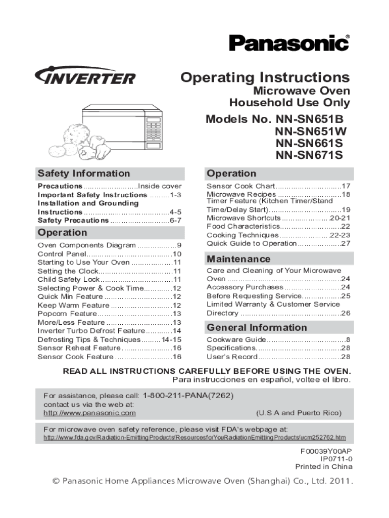 IP3516×39Y00AP×33×110630:IP3516×39Y00AP×00×110316.QED 2011630 Jerry 16:55 Page 1operating instructions Microwave oven household use only Models no. nnsn651b nnsn651W nnsn661s nnsn671ssafety