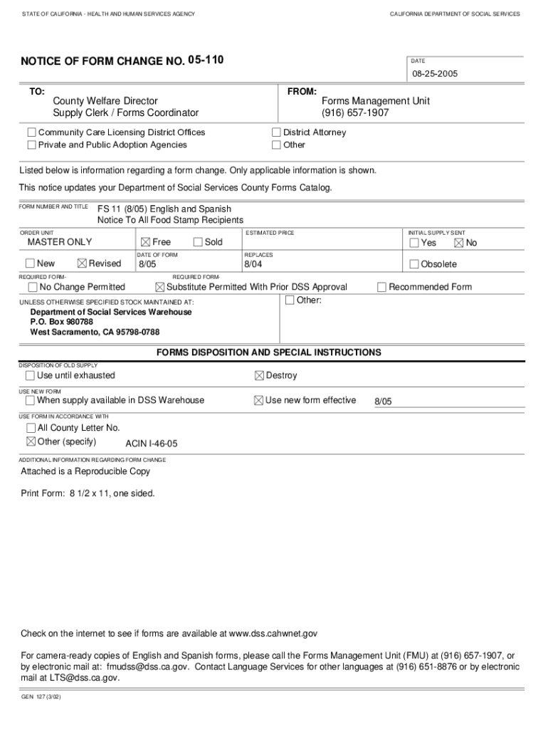 STATE OF CALIFORNIA HEALTH AND HUMAN SERVICES AGENCYCALIFORNIA DEPARTMENT OF SOCIAL SERVICESNOTICE OF FORM CHANGE NO. 05110DATE08252005 TO:FROM:County Welfare Director Supply Clerk / Forms CoordinatorForms