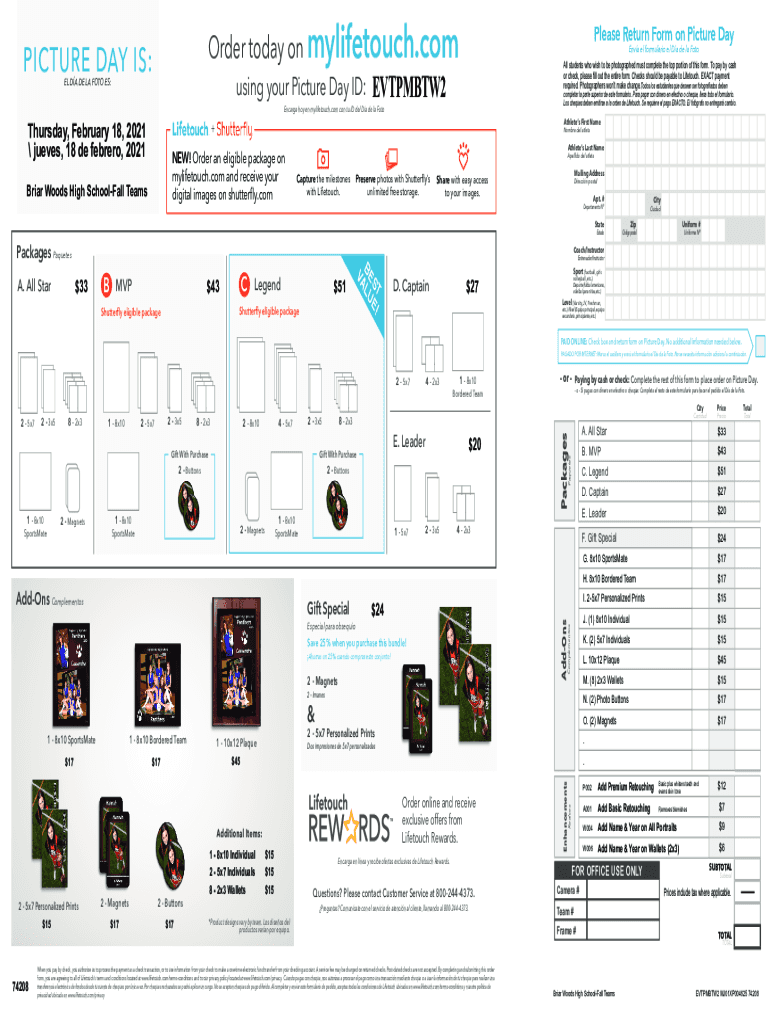Order today on mylifetouch.com using your Picture Day ID: EVTPMBTW2PICTURE DAY IS: EL DA DE LA SOTO ES:Please Return Form on Picture Day Envy El formulation El The DE la Football students who wish