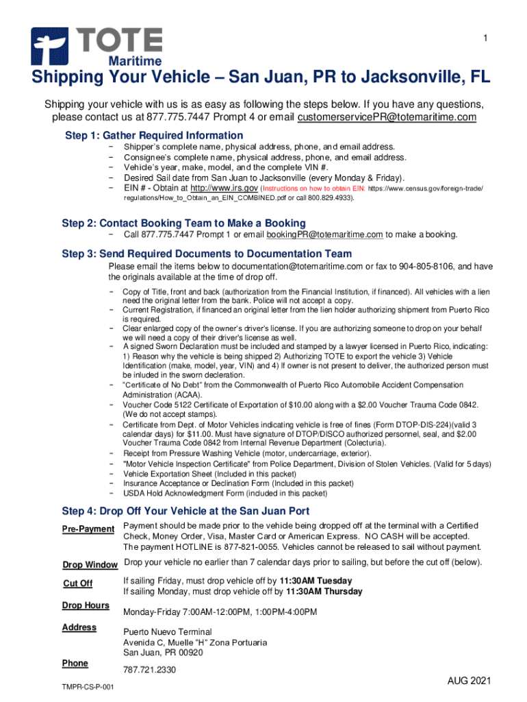 1Shipping Your Vehicle San Juan, PR to Jacksonville, FL Shipping your vehicle with us is as easy as following the steps below. If you have any questions, please contact us at 877.775.7447 Prompt 4