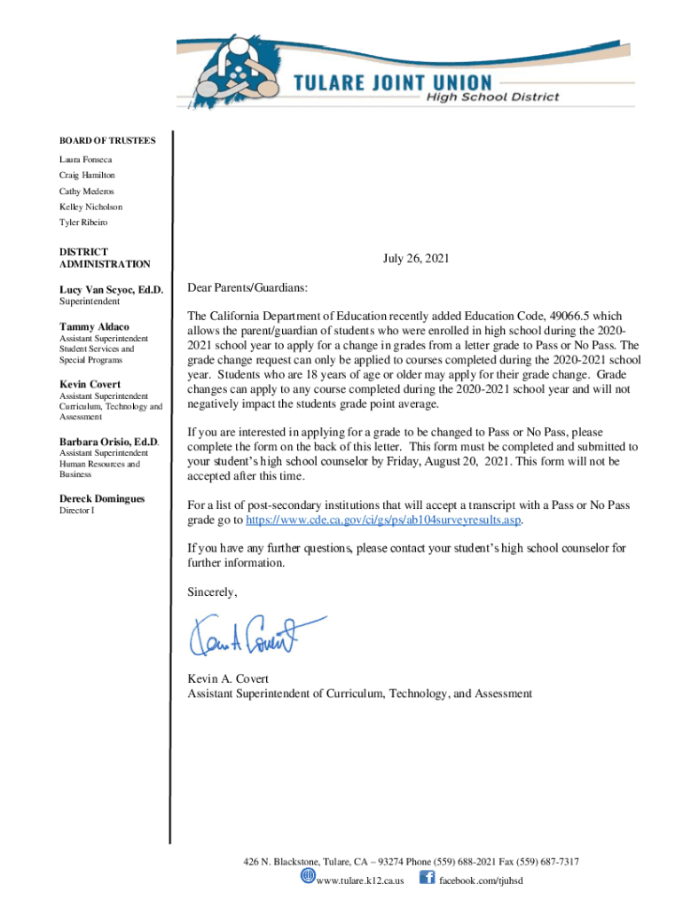 BOARD OF TRUSTEES Laura Fonseca Craig Hamilton Cathy Meters Kelley Nicholson Tyler RibeiroDISTRICT ADMINISTRATION Lucy Van Scoop, Ed. D. July 26, 2021, Dear Parents×Guardians:Superintendent Tammy