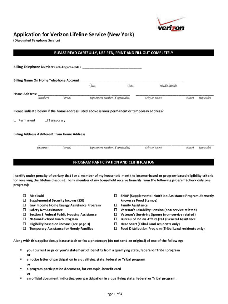 Application for Verizon Lifeline Service (New York) (Discounted Telephone Service×PLEASE READ CAREFULLY, USE PEN, PRINT AND FILL OUT COMPLETELY Billing Telephone Number (including area code) ___Billing