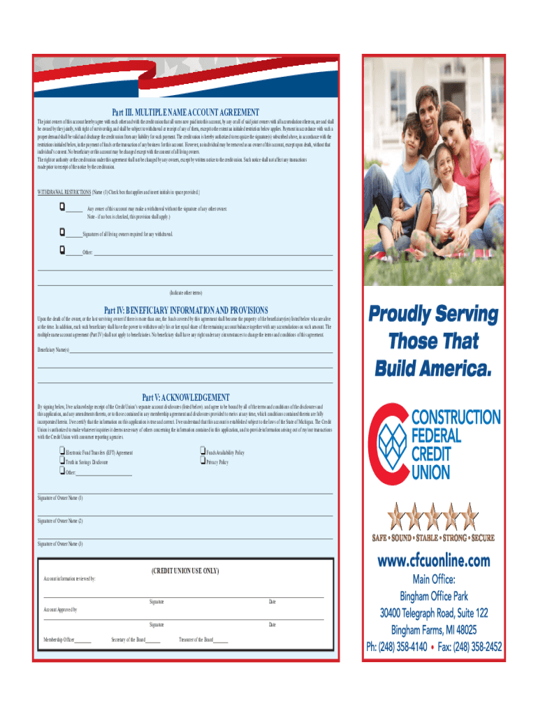 Part III. MULTIPLE NAME ACCOUNT Agreement joint owners of this account hereby agree with each other and with the credit union that all sums now paid into this account, by any or all of said joint