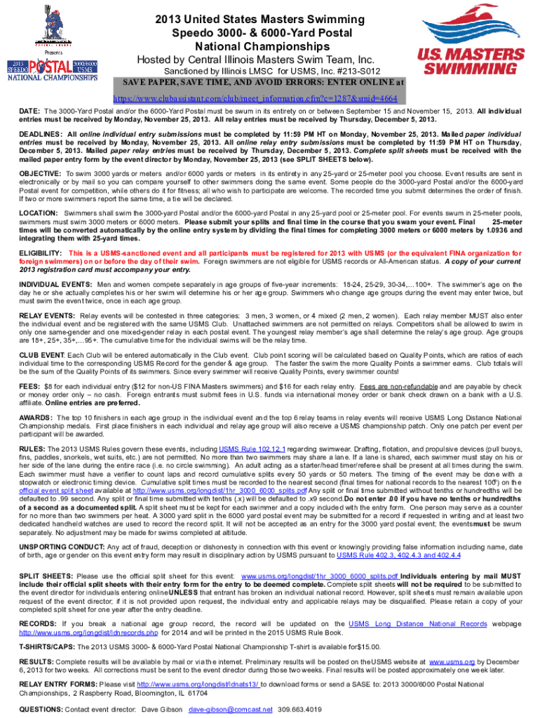 2013 United States Masters Swimming Speed 3000 & 6000Yard Postal National Championships Hosted by Central Illinois Masters Swim Team, Inc. Sanctioned by Illinois MSC for USES, Inc. #213S012 SAVE PAPER,