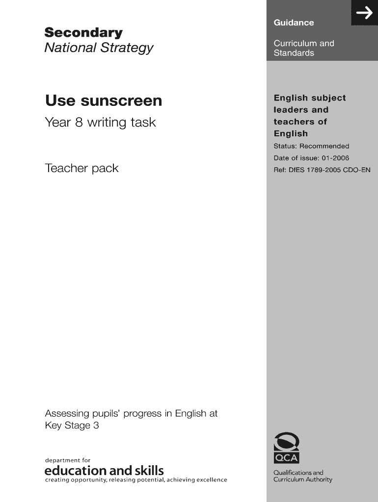 Guidance Secondary National Strategy Use sunscreen Year 8 writing task Curriculum and Standards English subject leaders and teachers of English Status: Recommended Date of issue: 012006 Teacher pack