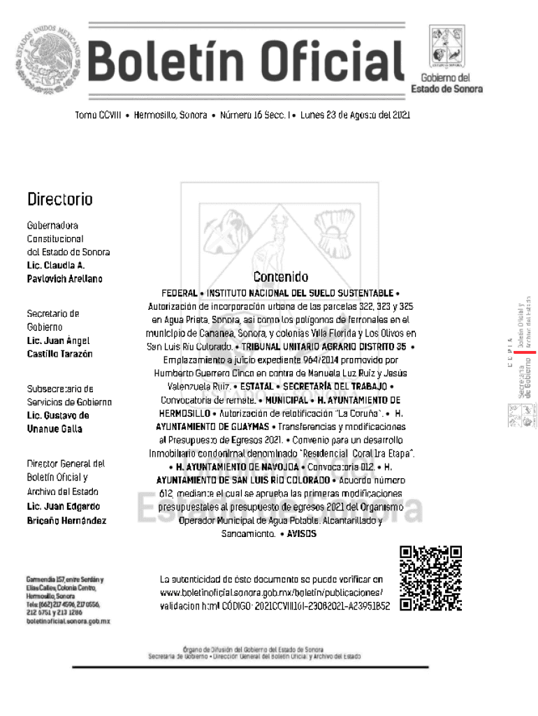 INSUSDelegacin Sonora.\') 11 ll RO IJACIOSAL HERMOSILLO, SONORA., A 20 de Acosta de 2021 FICO No. 1.8.26.3× 00807 /2021Sl HO SL\” STF:\' T.REPUBLICATION D E AUTHORIZATION DE INCORPORATION URBANA
