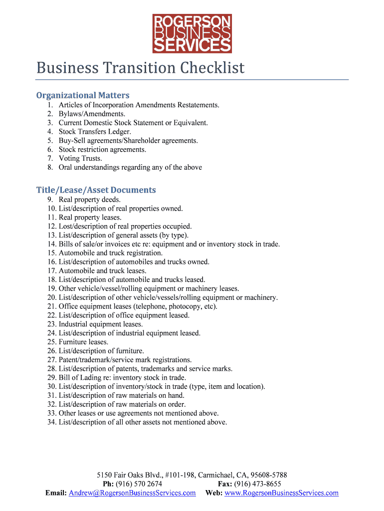 The Business Transition Checklist is a comprehensive document used by business owners and advisors to facilitate the sale, merger, or restructuring of a business.