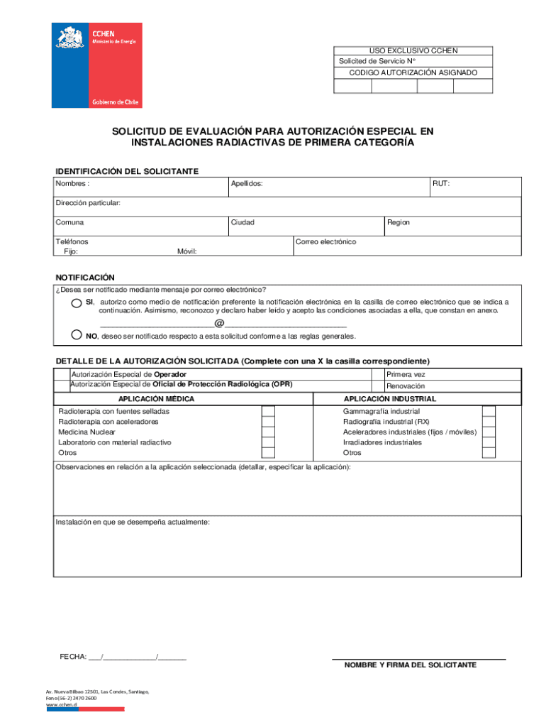 Get the free SOLICITUD DE EVALUACIN PARA AUTORIZACIN ESPECIAL EN ... - CCHEN