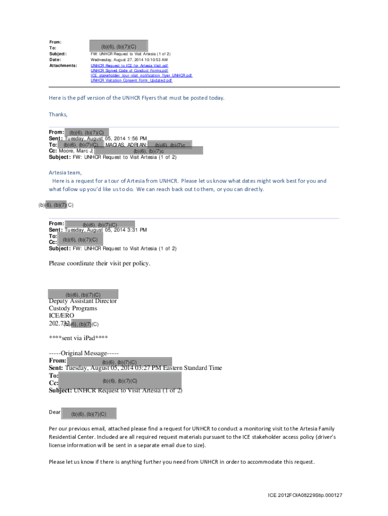 From: To: Subject: Date: Attachments:(b)(6×, (b)(7)(C) FW: UNHCR Request to Visit Artesian (1 of 2) Wednesday, August 27, 2014 10:10:53 AM UNHCR Request to ICE for Artesian Visit.pdf UNHCR Signed