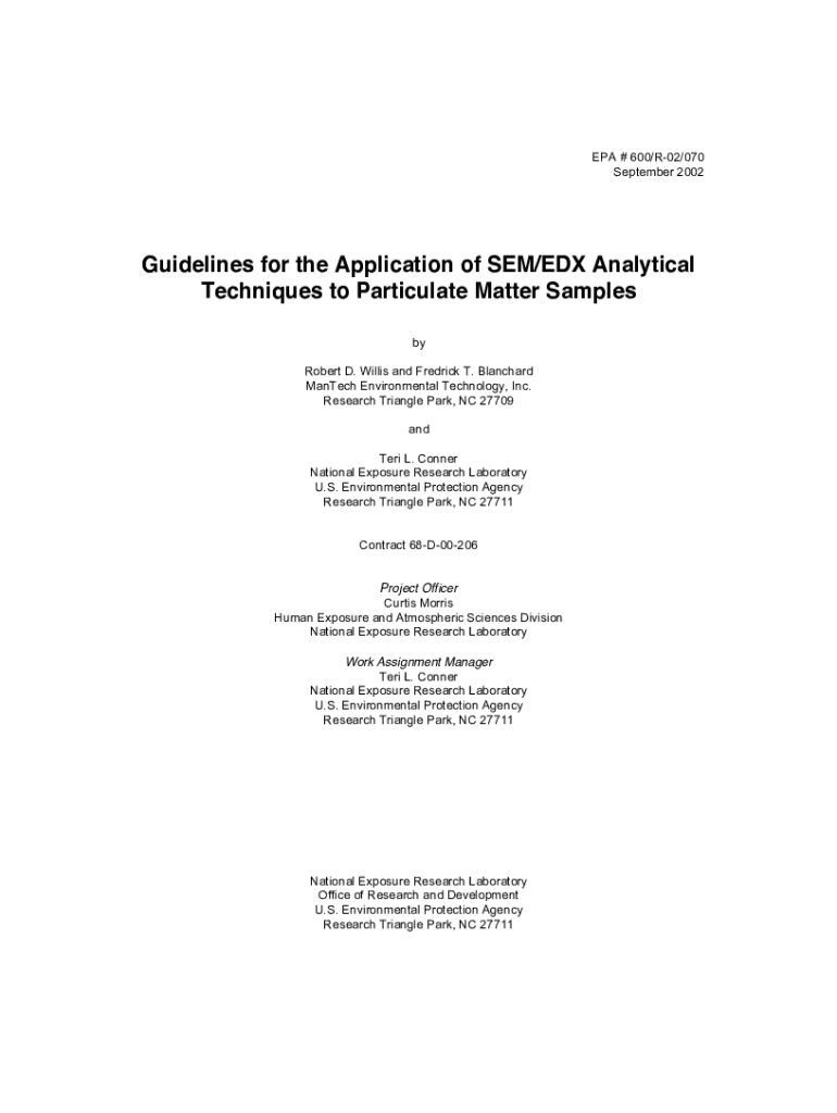 EPA # 600×R02/070 September 2002Guidelines for the Application of SEM×EDX Analytical Techniques to Particulate Matter Samples by Robert D. Willis and Fredrick T. Blanchard Manteca Environmental
