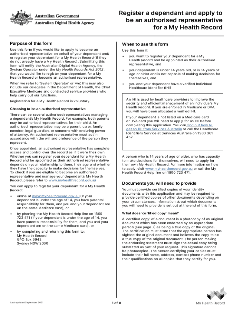 Register a dependent and apply to be an authorized representative for a Health Record Purpose of this former to use this forms this form if you would like to apply to become an authorized representative