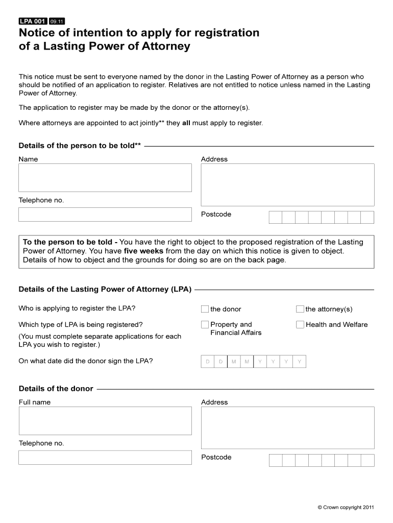 Notice of intention to apply for registration of a Lasting Power of Attorney. This notice must be sent to everyone named ...