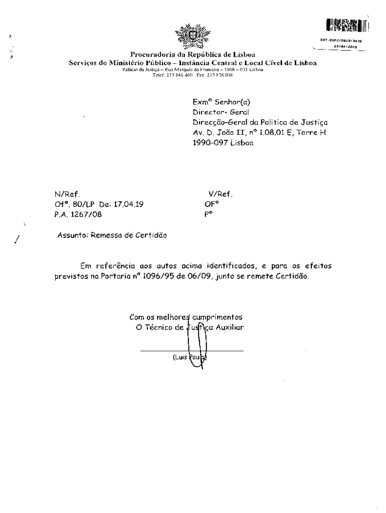 ENTROPY/2019/3475 23/04/2019Procuradoria the Replica de Lisboa Servos do Minis trio Public Instance Central e Local CEL de Lisboa Polio the Justin RUA Marcus the Frontera 1098 001 Lisbon Tyler:213