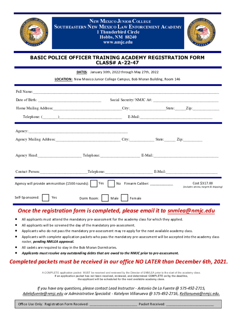NEW MEXICO JUNIOR COLLEGE SOUTHEASTERN NEW MEXICO LAW ENFORCEMENT ACADEMY 1 Thunderbird Circle Hobbs, NM 88240 www.nmjc.eduBASIC POLICE OFFICER TRAINING ACADEMY REGISTRATION FORM CLASS# A2247 DATES: