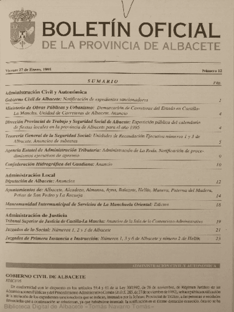 BOLEYN OFFICIAL DE U PROVINCIAL Earned 27 de Nero, D. ALL.,ZETE1995Nmero 12SUMARIOPg. Administration Civil y Autonomic Governor Civil de Albacete: Notification DE expedients sancionadores1Ministerio