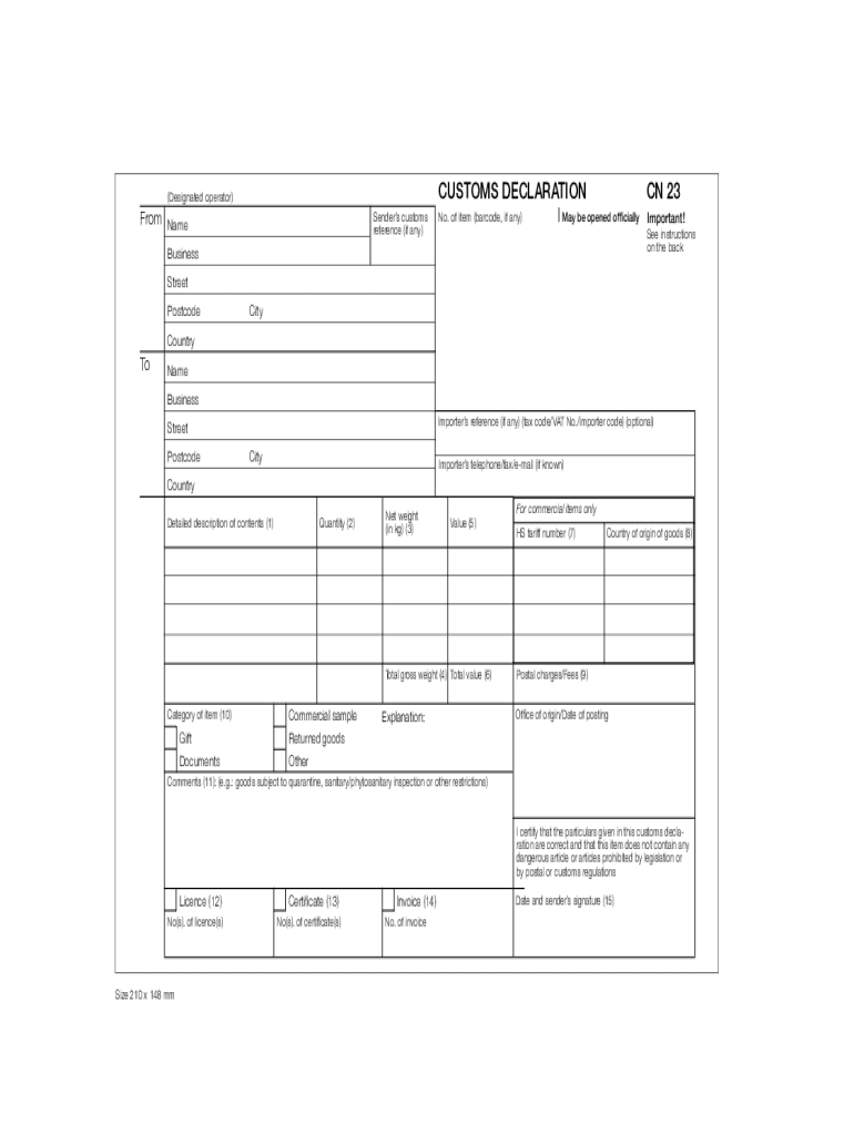 (Designated operator×FromSenders customs reference (if any×Accustoms declaration CN 23No. Of item (barcode, if any×Important! May be opened officially instructions on the backBusiness Street PostcodeCityCountryToName