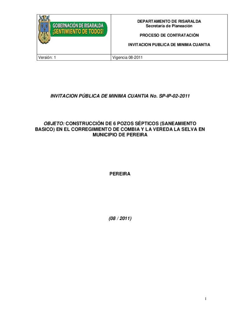DEPARTMENT DE RISARALDA Secretary de Planeacin PROCESS DE CONTRATACIN INVITATION PUBLIC DE MINIMA QUANTA Version: 1Vigencia 082011INVITACION PBL ICA DE MINIMA QUANTA No. SPIP022011OBJETO: CONSTRUCTION